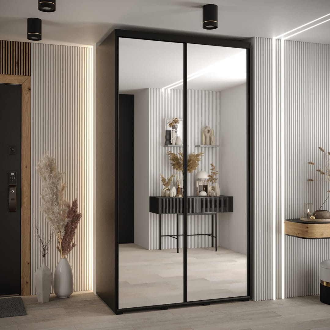 The Cannes II 140cm, compact and efficient, is tailored for maximizing storage in smaller rooms without compromising on style. It features two sliding doors, one hanging rail, and six shelves, effectively optimizing space utilization. Made from 16mm high-quality laminated board with PVC-finished edges, it ensures longevity and aesthetic appeal. Equipped with black steel handles, and with the option for drawers and decorative strips, this wardrobe offers customizable storage solutions, enhancing functionality and appearance in compact living areas.