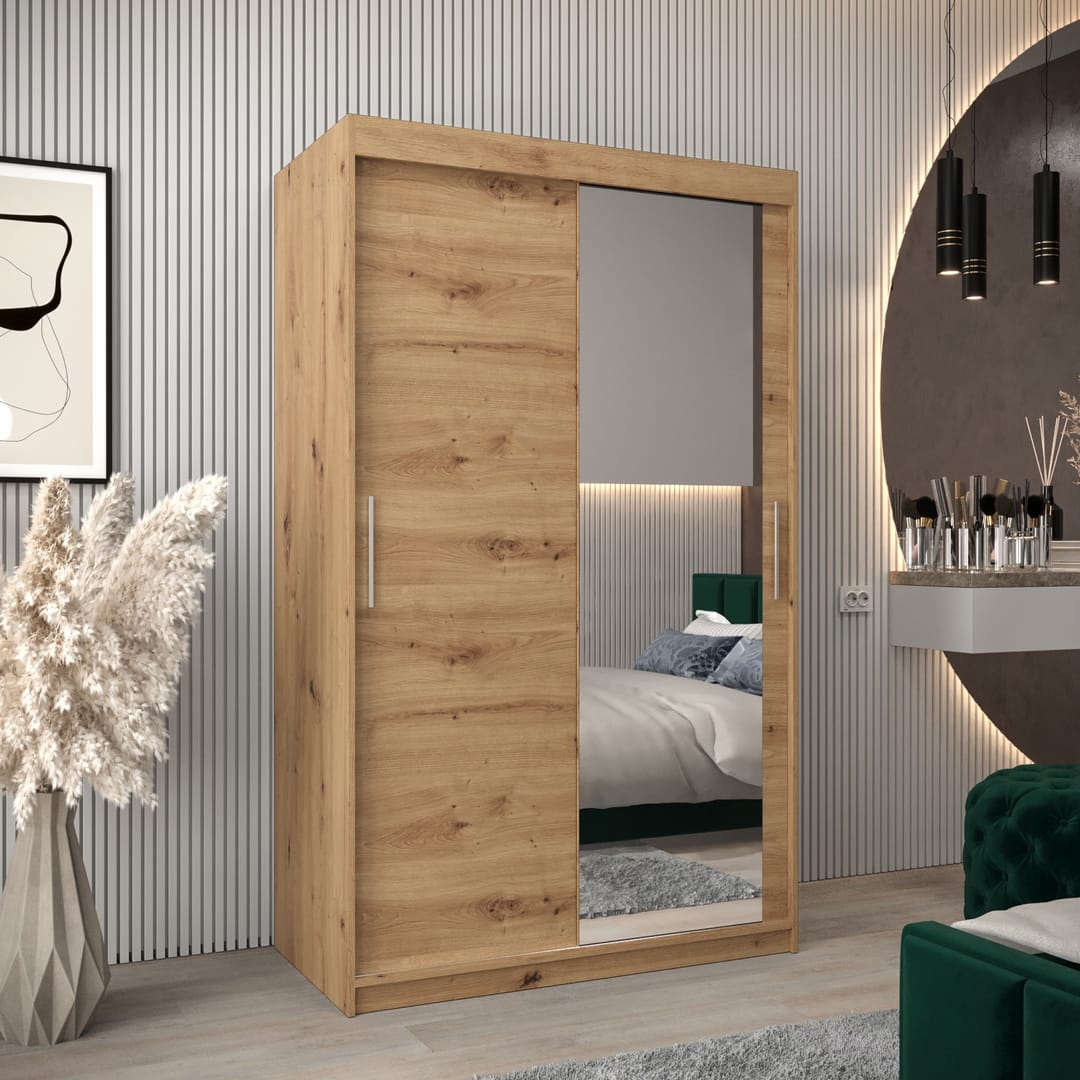 Upgrade your bedroom organization with the Tokyo II Sliding Door Wardrobe. This wardrobe boasts two sliding doors, one of which is mirrored, adding a touch of elegance to your space. With five shelves and two hanging rails, it offers ample storage for your clothing and accessories. The silver plastic handles not only add a modern touch but also make it easy to open and close the doors. Crafted from 16mm laminated board with PVC-finished edges, this wardrobe is built to last.