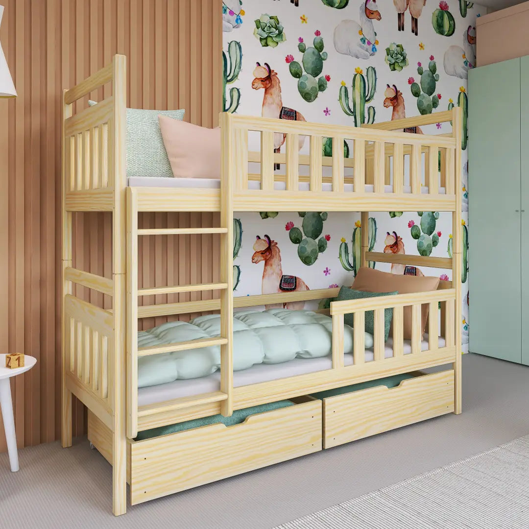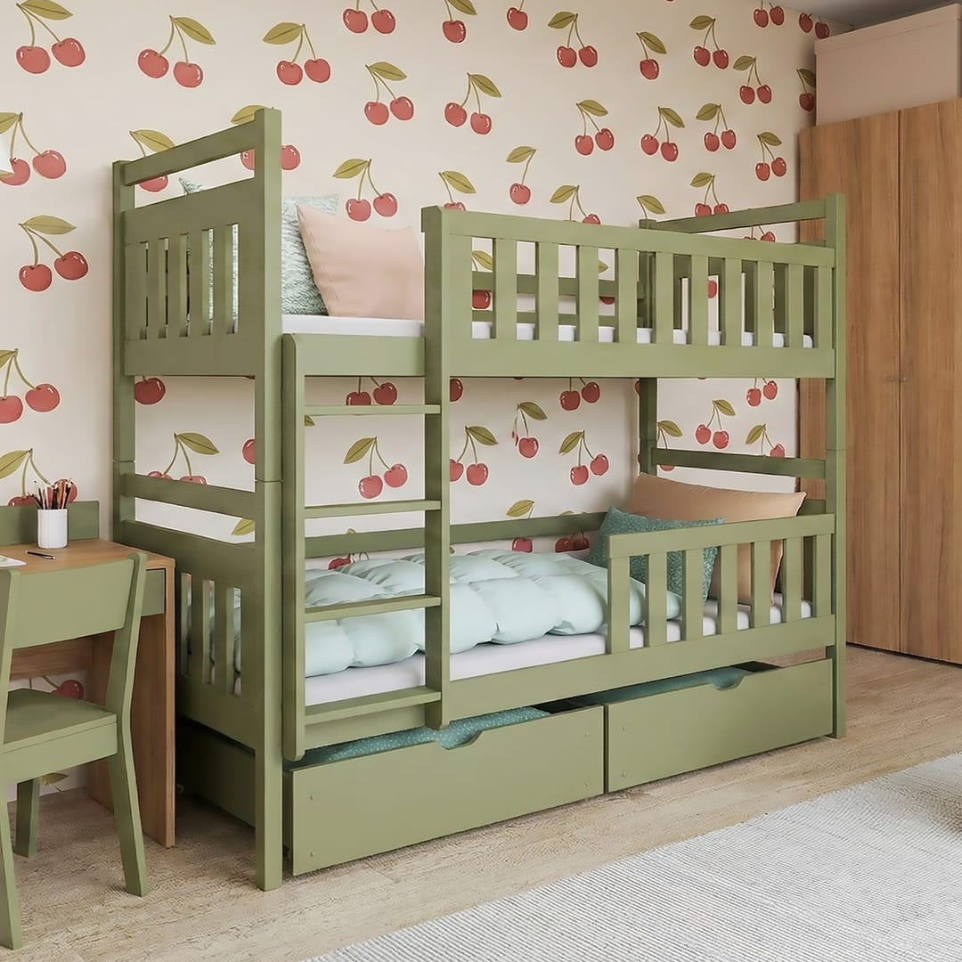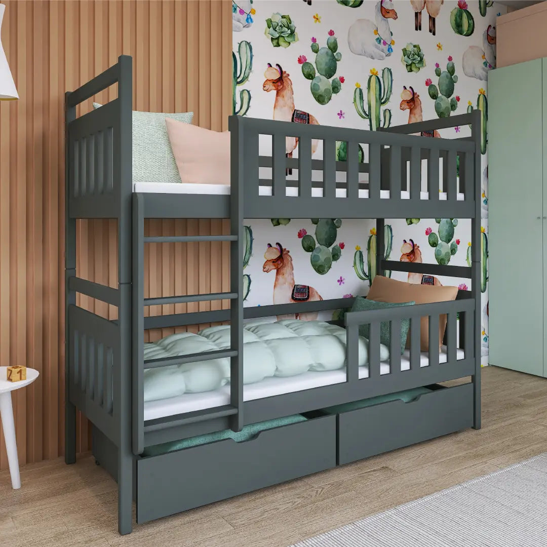 The Monika Bunk Bed is an elegant piece of furniture for two children. It can be a practical alternative to a low double bed in terms of space-saving and portability. It is recommended especially for children who can cope with climbing a ladder. Both the upper and lower sleeping places have been additionally secured with railings and there is a pair of drawers at the bottom for extra storage capacity. This bed is available in several colours.