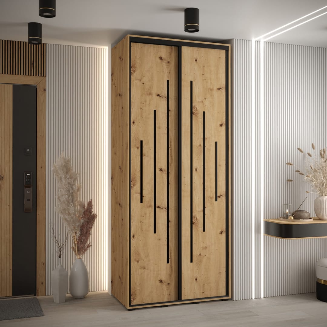 The Cannes XII Sliding Door Wardrobe 110cm is the narrowest model in the series, designed for very compact spaces. It provides efficient storage solutions with two sliding doors, one hanging rail, and six shelves. Constructed from 16mm laminated board with PVC edges and available in black, oak artisan, and white, it features black steel handles. Customize with additional drawers and decorative strips for a tailored look and enhanced functionality.