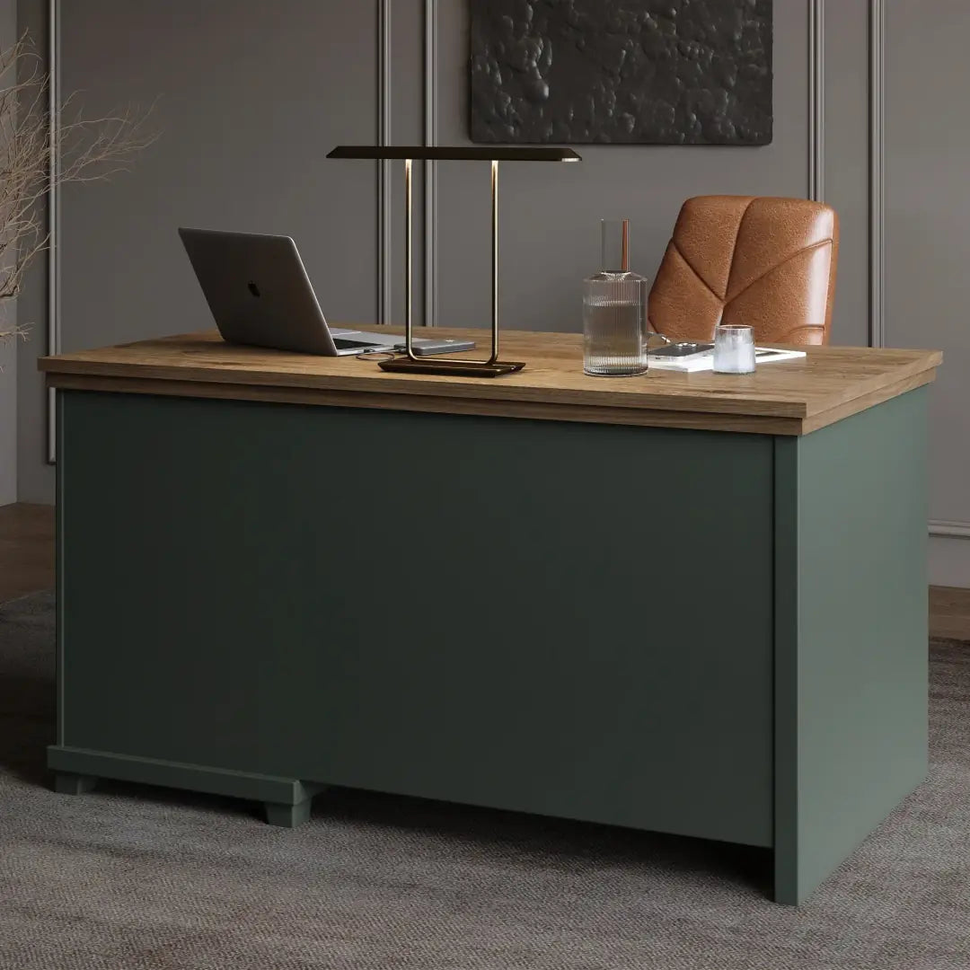 The Evora Office Desk 140cm is tailored for efficiency in compact settings. Its four drawers with soft-close mechanisms ensure smooth, quiet operation, while the spacious top provides ample room for laptops and documents. A Green and Oak Lefkas finish imparts modern sophistication, and ABS-edged laminated board construction stands up to daily use. Pair this desk with coordinating pieces to complete a polished, functional office ensemble.