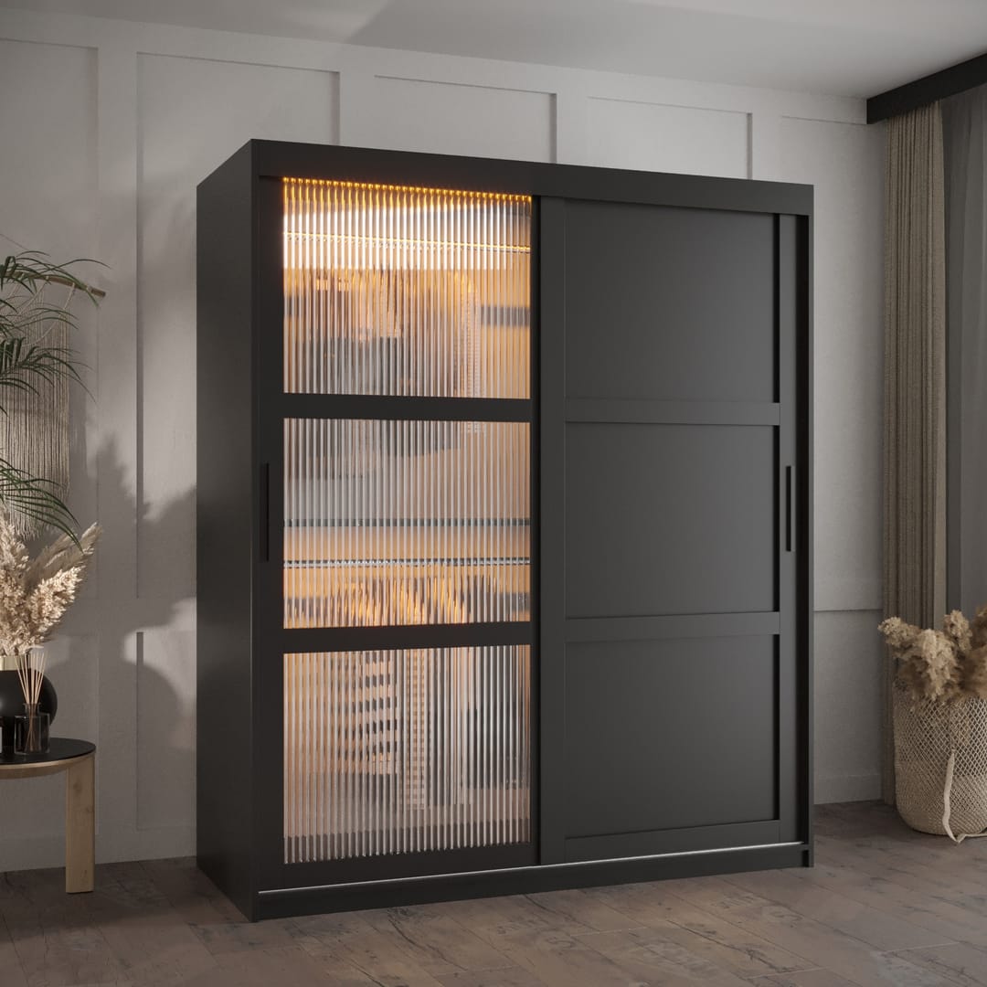 Redefine your storage options with the Flutes III Sliding Door Wardrobe 150cm, perfectly sized for medium spaces and offering a blend of aesthetics and practicality. This model comes with two sliding doors with transparent glass, five shelves, and two hanging rails, constructed from laminated board with an MDF front. Featuring silver handles, PVC finished edges, and options for drawers and LED lighting, it's an ideal choice for those looking to enhance their storage without compromising on style.