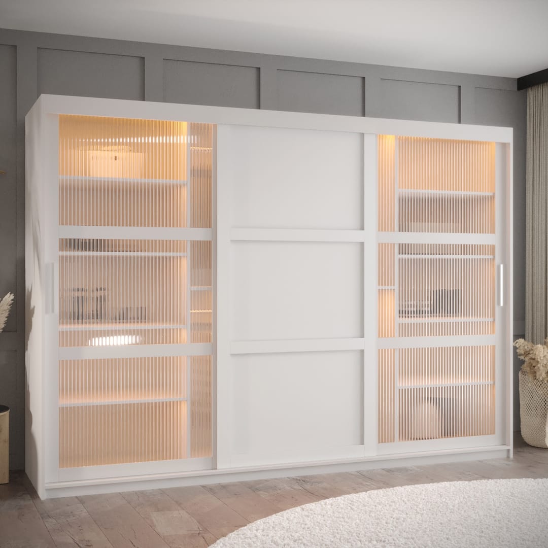 Elevate your storage with the Flutes III Sliding Door Wardrobe 250cm, a grand piece that combines extensive storage with a sleek, modern appearance. This wardrobe features three sliding doors with transparent glass, nine shelves, and two hanging rails, offering a spacious and organized storage solution. Made from 16mm high-quality laminated board with an MDF front, it comes with silver plastic handles, PVC finished edges, and options for drawers and LED lighting, making it both functional and stylish.