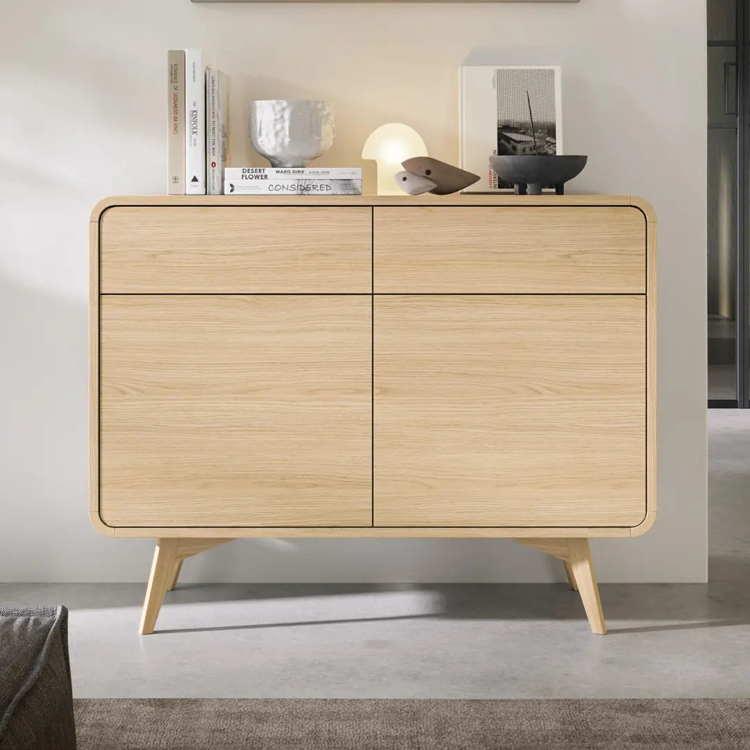 Redefine your dining space with the Helion Sideboard Cabinet 108cm, featuring two doors and drawers that keep essential dinnerware and linens organized yet easily accessible. Its compact width fits perfectly in smaller dining areas while providing generous storage capacity, and the handle-free push-to-open mechanism ensures noiseless operation. The warm wooden legs create visual warmth and elevate the piece, making this sideboard ideal for cozy dining rooms that value both functionality and natural style.