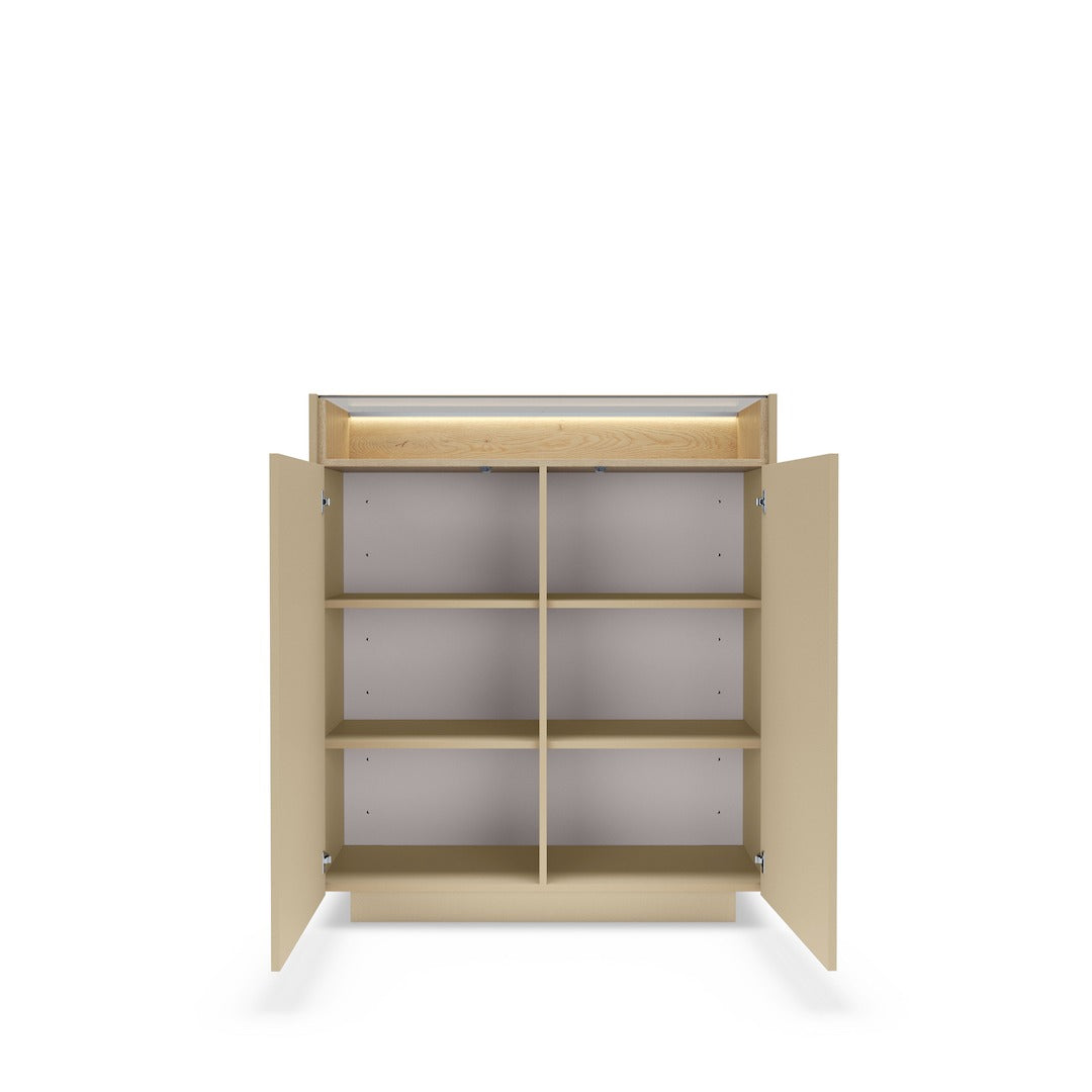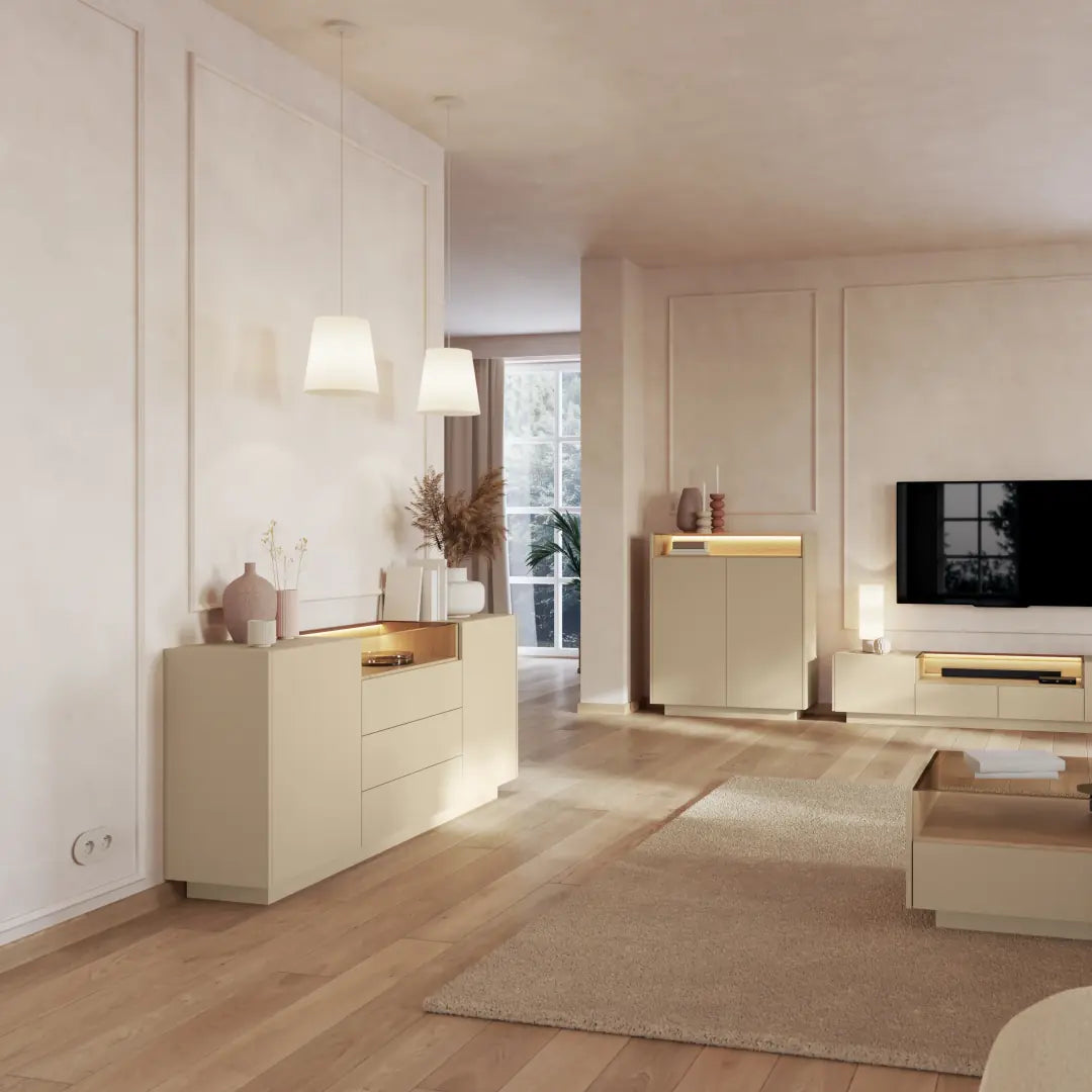 Sleek, handle-free push-to-open doors enhance its minimalist appeal, while subtle LED Lighting adds a soft, ambient glow. Crafted from durable materials with tempered glass details and full-extension drawers, Hiro [Living Room] combines everyday practicality with understated elegance - perfect for creating a stylish, modern interior.