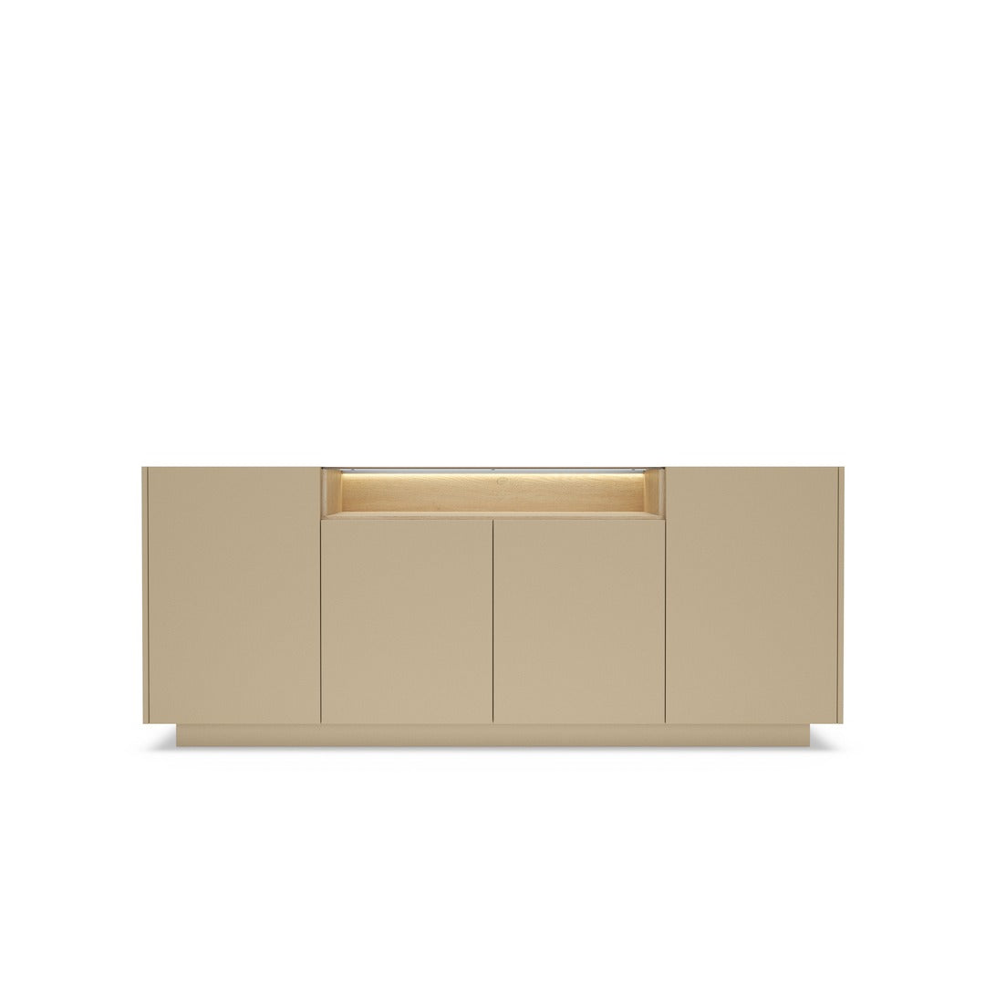 Sleek, handle-free push-to-open doors enhance its minimalist appeal, while subtle LED Lighting adds a soft, ambient glow. Crafted from durable materials with tempered glass details and full-extension drawers, Hiro [Living Room] combines everyday practicality with understated elegance - perfect for creating a stylish, modern interior.
