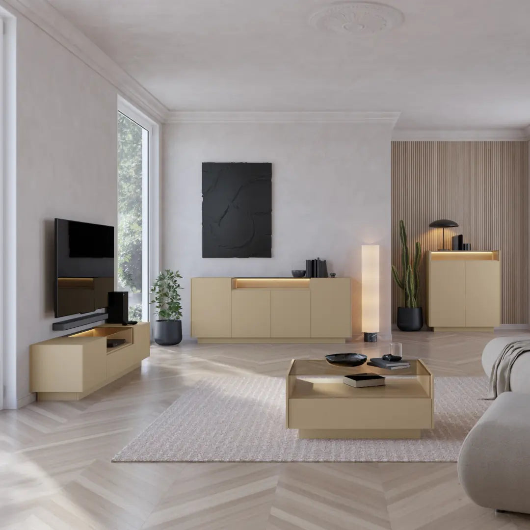 Sleek, handle-free push-to-open doors enhance its minimalist appeal, while subtle LED Lighting adds a soft, ambient glow. Crafted from durable materials with tempered glass details and full-extension drawers, Hiro [Living Room] combines everyday practicality with understated elegance - perfect for creating a stylish, modern interior.