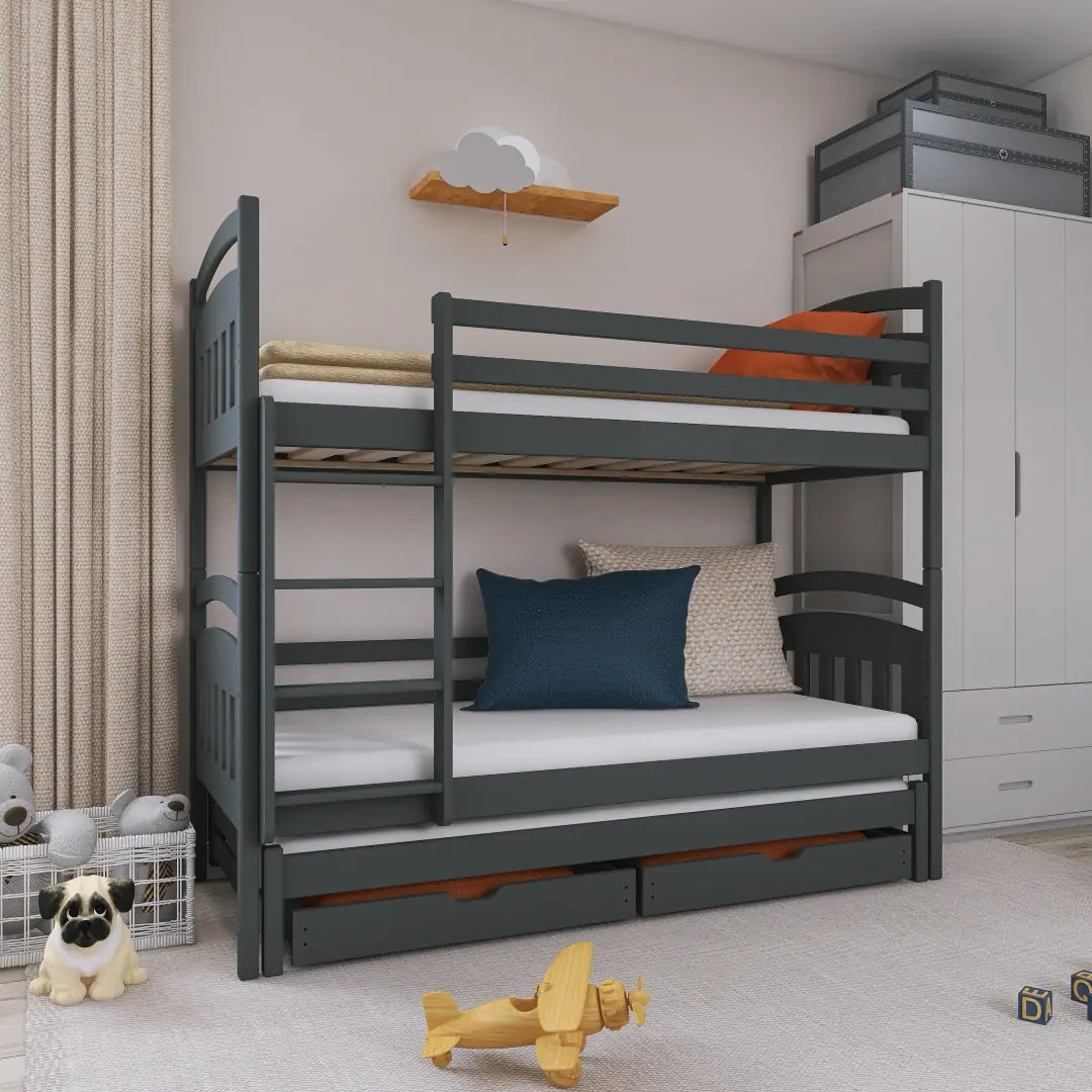 The Alan Bunk Bed can accommodate up to three children and is ideal for large families or overnight guests. The bed is versatile and has a pull-out bed that can be pulled out. You can also dismantle it and convert it into three separate beds. The bed is made of solid pine for this purpose. It shows a minimalist, modern design that charmingly rounds off every children's room.