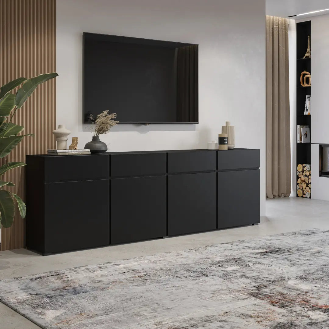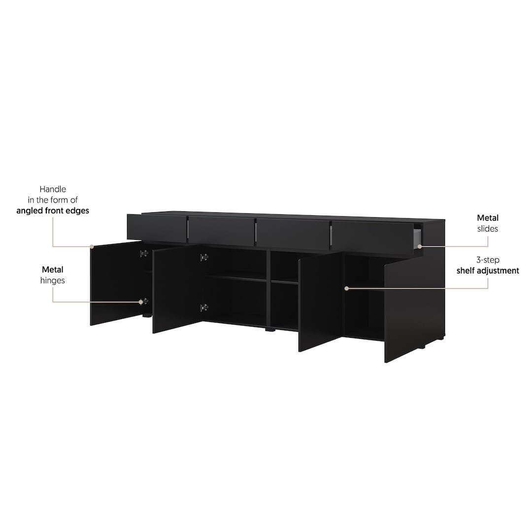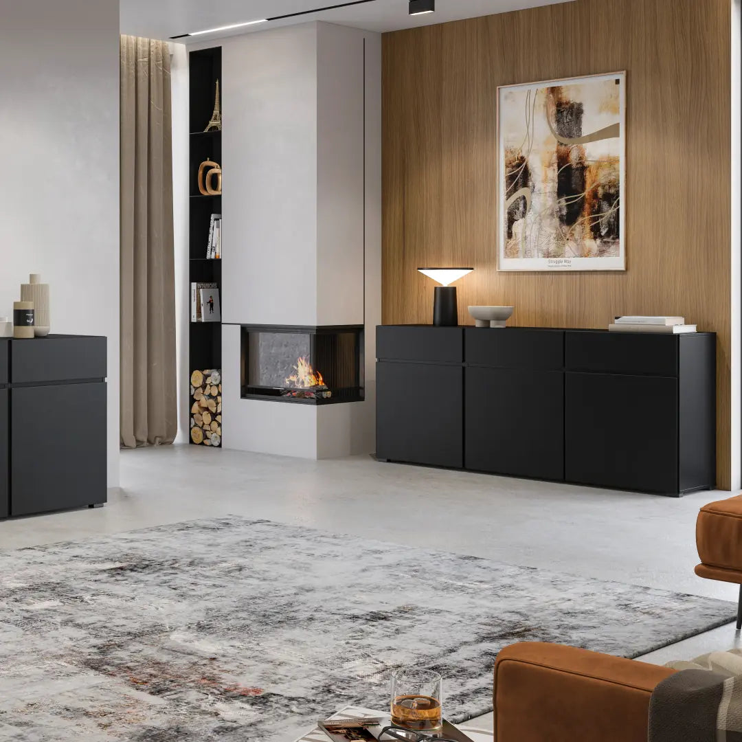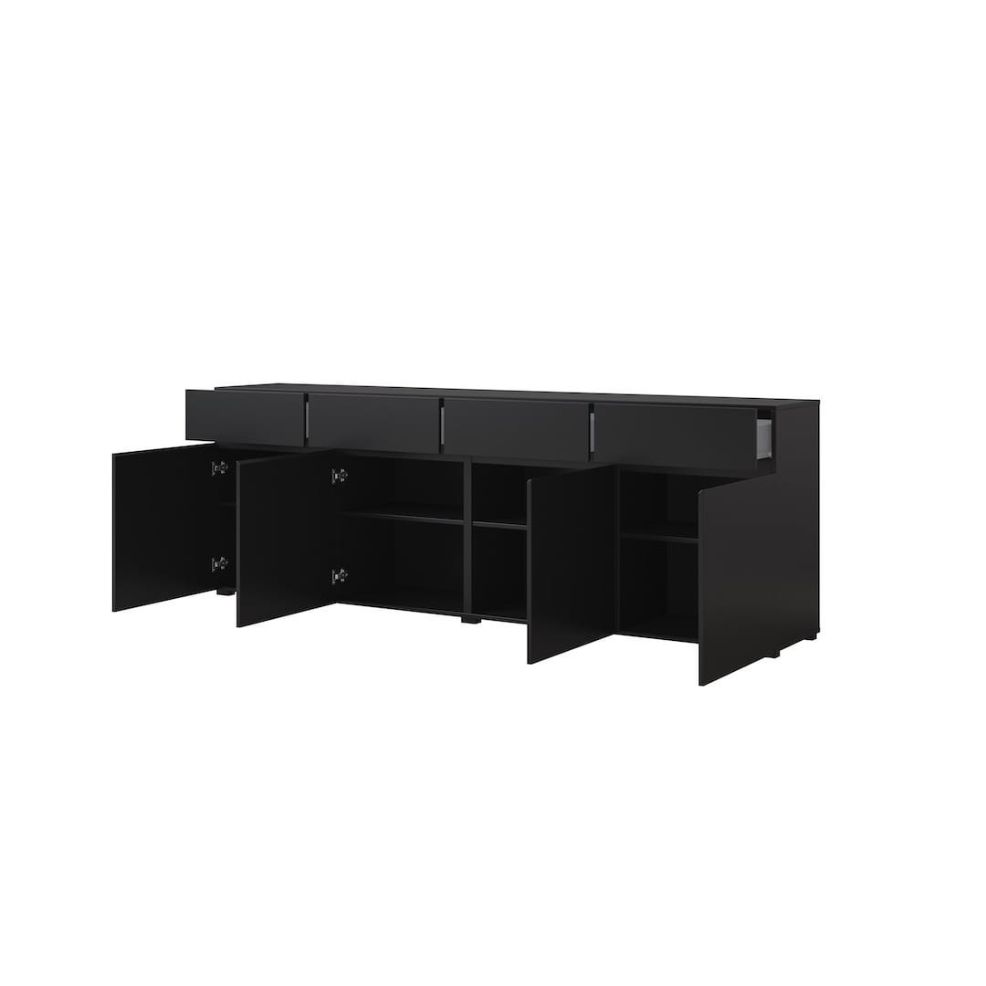 The Kross 25 Sideboard Cabinet brings a sophisticated touch to storage, crafted from durable 16mm laminated board for long-lasting use. Its four hinged doors open to reveal ample space, with drawers and shelving thoughtfully integrated for easy categorization of household items. This cabinet is a perfect balance between utility and modern aesthetics, fitting seamlessly into various interior styles.