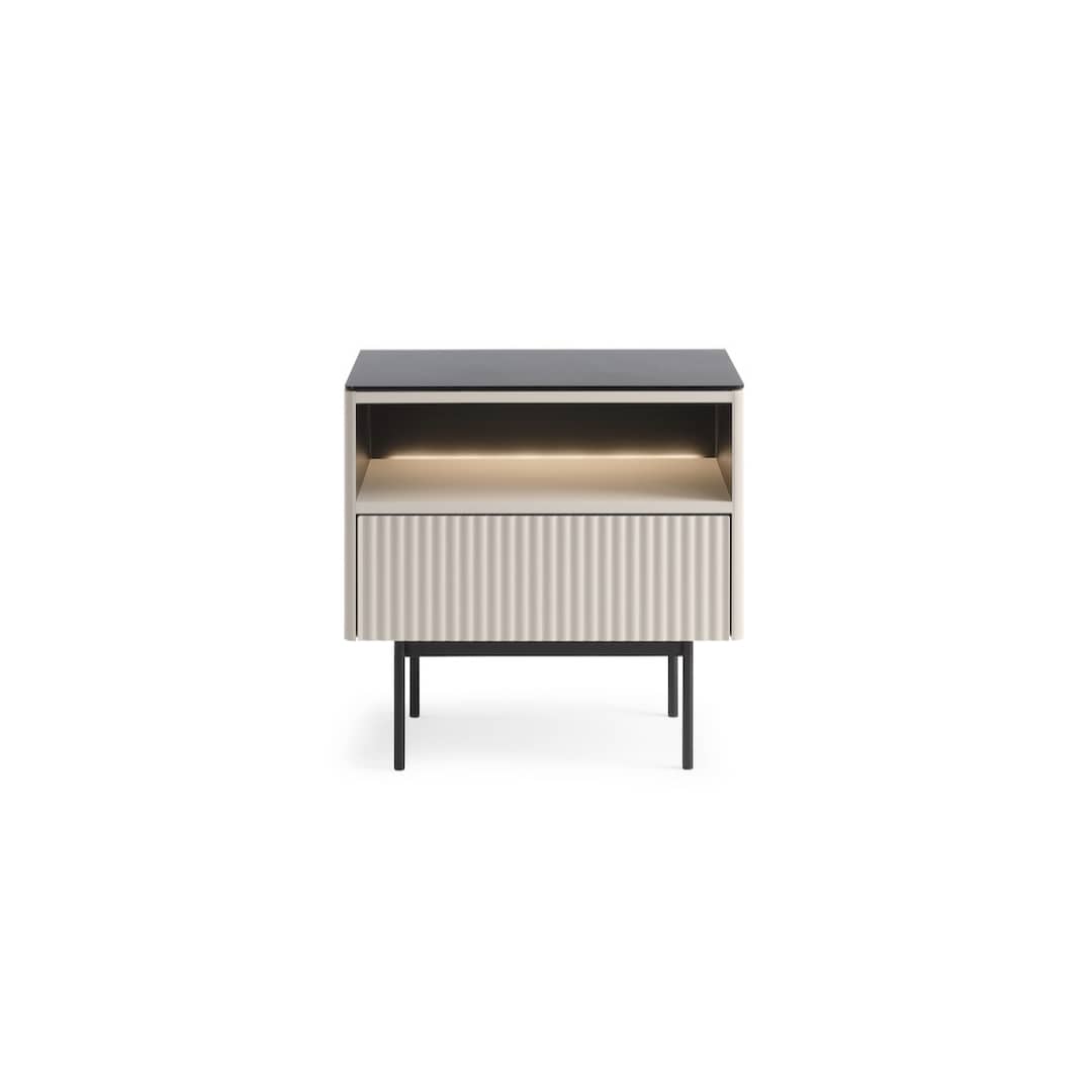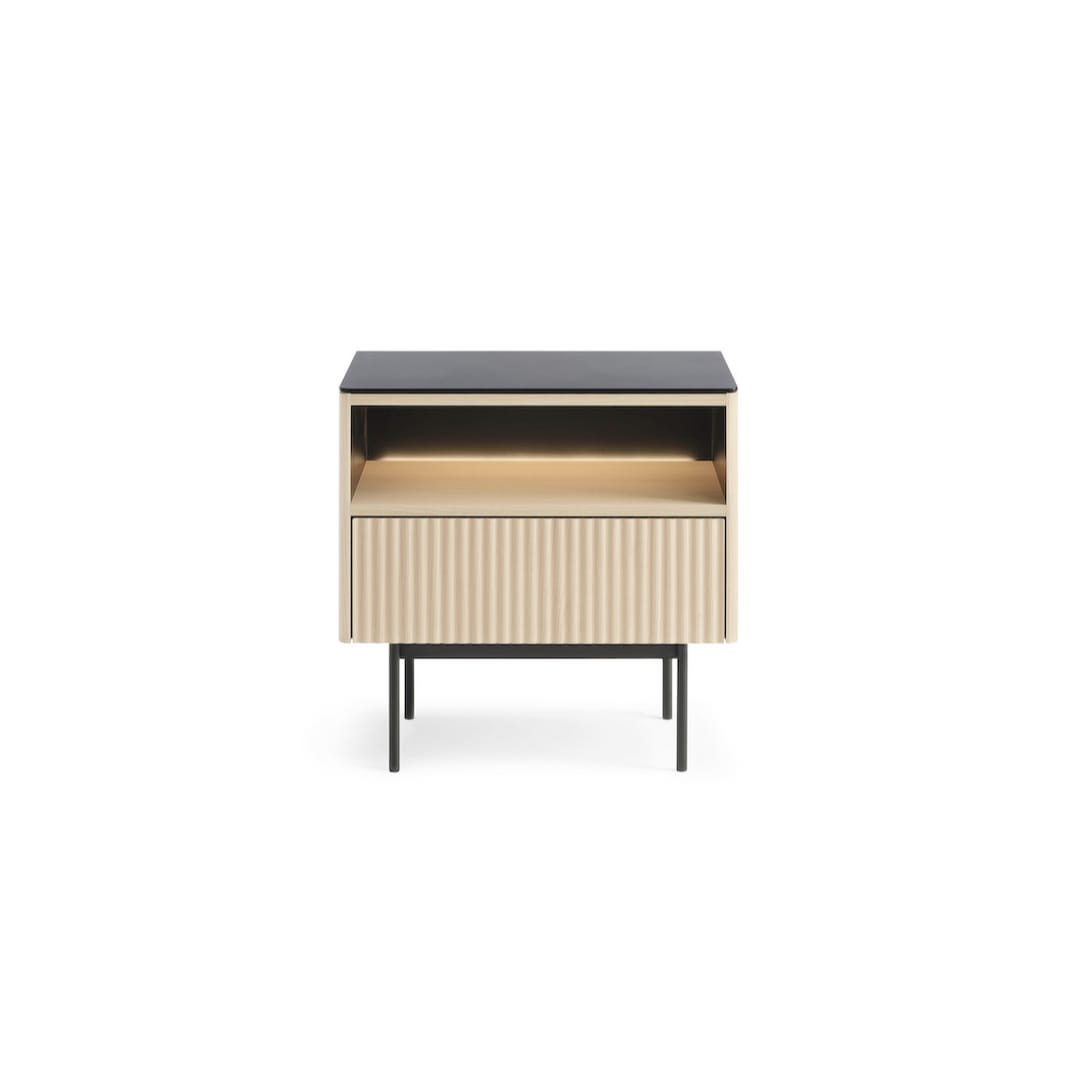Compact and well defined, the Orta Cabinet 57cm balances display and concealed storage in a neat format. An open compartment, highlighted by integrated LED lighting, is perfect for showcasing prized possessions, while the lower drawer features a vertically fluted front that adds texture and visual depth. Supported by slim black metal legs, the cabinet maintains a light, stable stance. ABS edging and laminated board construction provide durability suited to everyday use.