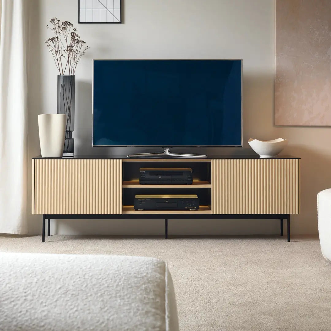 The Orta TV Cabinet 180cm brings together textured door fronts and an open central section designed to accommodate media equipment with ease. Hinged doors on either side conceal practical storage, while the central open shelf keeps multimedia devices and accessories within reach. An integrated cable management system helps keep wiring neatly organised, maintaining a clean setup around the TV area. Slim black metal legs support the cabinet’s structure, while laminated board construction, MDF fronts, and ABS edging ensure durability for everyday use.