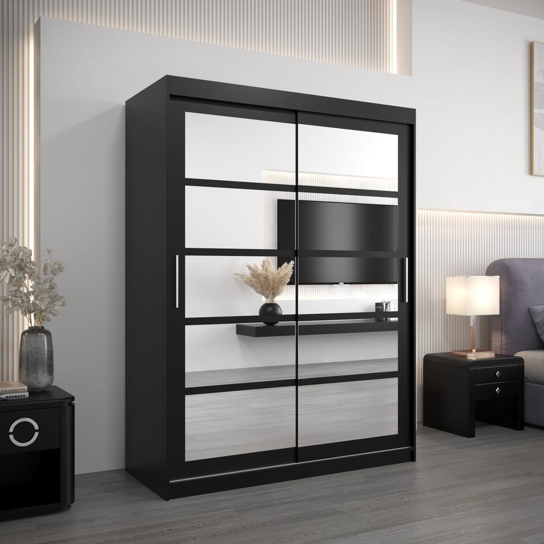 The Roma II Sliding Door Wardrobe 150cm combines practicality with style. Store a vast array of clothing thanks to five internal shelves and two hanging rails, all enclosed behind smooth-sliding doors to keep your space clutter-free. Mirrored panels not only give the illusion of more space but also add a touch of elegance, and the PVC-finished edges ensure longevity—a chic solution for your storage needs.