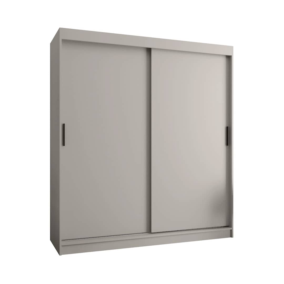 The Rubino T Sliding Door Wardrobe 180cm is designed for everyday practicality in a mid-sized frame. Two sliding doors open to eight shelves and two hanging rails, giving clear space for folded garments, shoes and longer pieces. PVC-finished edges protect the laminated board, keeping the surface resilient to daily wear. Available in a cashmere finish with contrasting black handles, this wardrobe delivers organised storage in a simple, contemporary style.