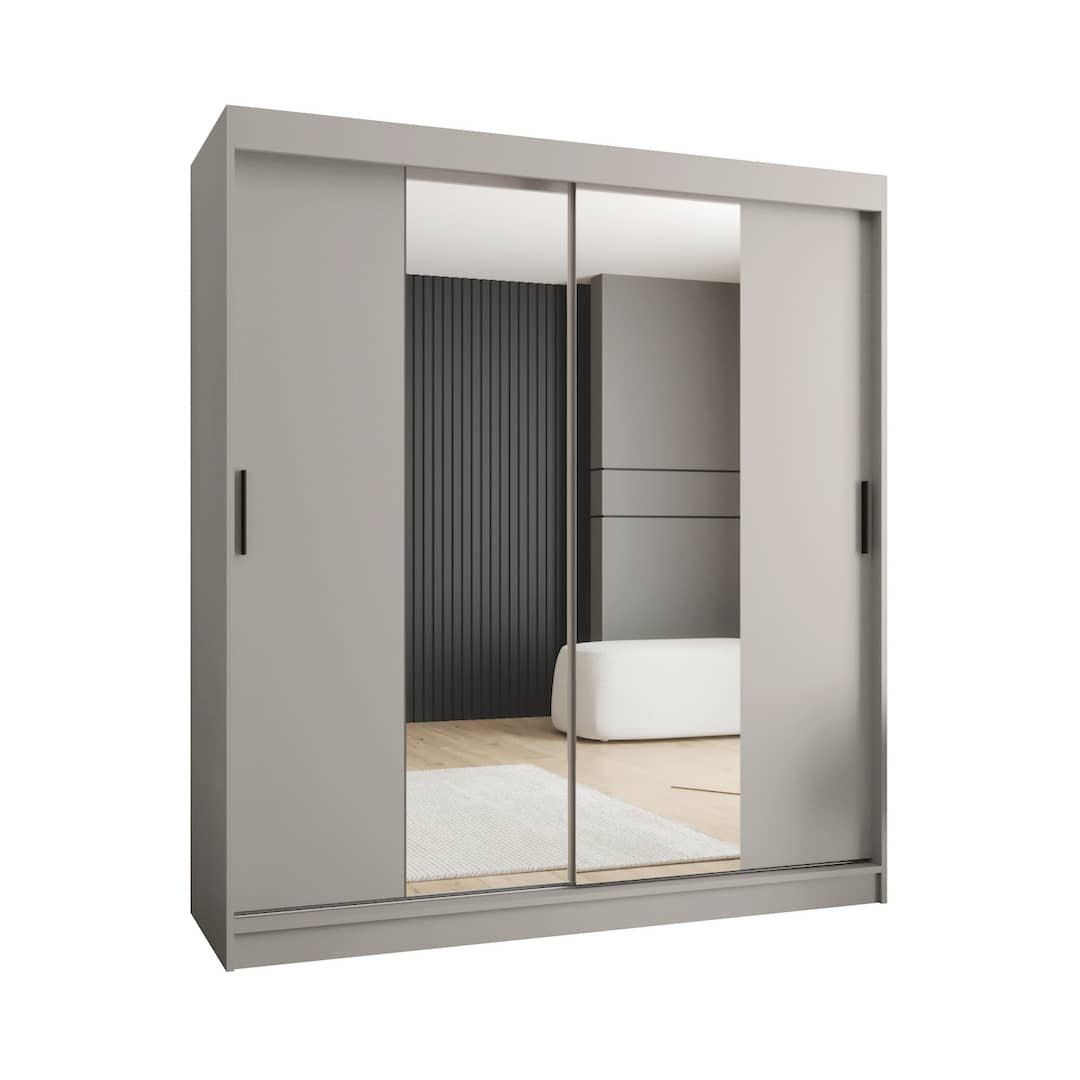 The Rubino T1 Sliding Door Wardrobe 180cm features two fully mirrored sliding doors that open up the room visually while keeping clothes neatly hidden. Eight interior shelves and two hanging rails provide reliable storage for both folded and hanging garments. The mirrored finish adds brightness without cluttering the wall. Ideal for mid-sized bedrooms, this wardrobe brings together functional layout and clean, modern styling.