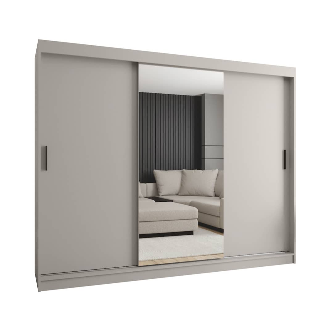 Elevate your storage space with the Rubino T1 Sliding Door Wardrobe 250cm, designed with three sliding doors—one mirrored—to brighten the room and keep clothing neatly arranged. Inside, eight shelves and two hanging rails give you space for folded garments, outerwear and everyday accessories. The mirrored panel acts as a full-length dressing mirror, helping reduce clutter. With its generous size and smart layout, this wardrobe suits spacious bedrooms that need both storage and simplicity.