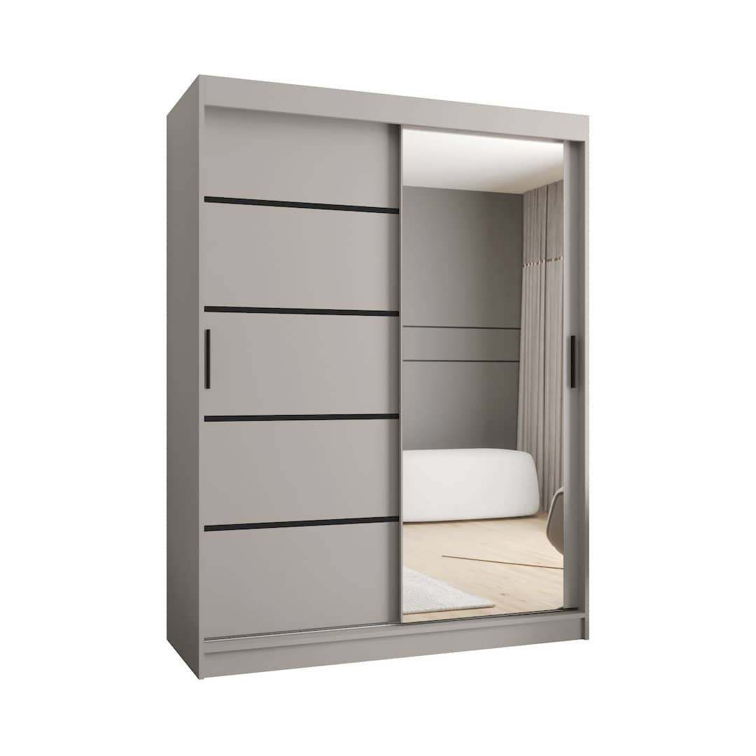 Optimise compact bedrooms with the Rubino V2 Sliding Door Wardrobe 150cm. Its two sliding doors, including a mirrored panel, reveal a neatly arranged interior. Inside, five shelves and two hanging rails accommodate folded garments and hanging outfits efficiently. The mirror reflects natural light to add depth, while the sliding panels save valuable floor area. With a modest footprint and a clean cashmere finish, this wardrobe offers practical storage without overwhelming smaller rooms.