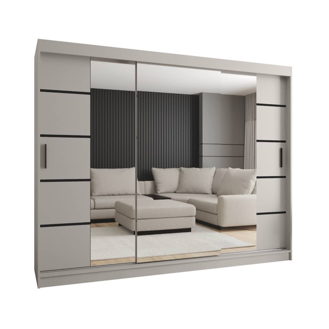 Transform your storage with the Rubino V4 Sliding Door Wardrobe 250cm. Its three mirrored sliding doors reveal a spacious interior designed for organised living. Eight shelves and two hanging rails provide clear sections for both folded and hanging garments. The integrated mirrors reflect light and add visual depth, while optional decorative strips and drawers allow flexible storage. Finished in cashmere with subtle black handles, this wardrobe delivers style and capacity for larger bedrooms.