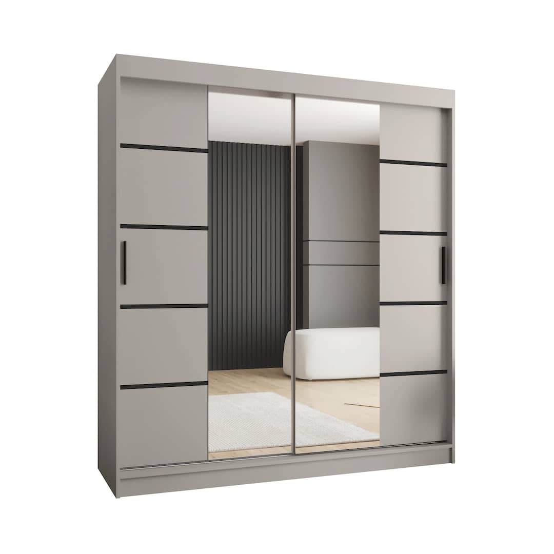 Redefine bedroom organisation with the Rubino V4 Sliding Door Wardrobe 180cm. Its two mirrored sliding doors glide open to an interior with eight shelves and two hanging rails, allowing clear separation of garments and accessories. The mirrored surfaces reflect light, creating a more spacious feel. The wardrobe’s customisable options, including black decorative strips and additional drawers, let you adapt storage to your needs. Black handles and a cashmere finish complete its streamlined look.